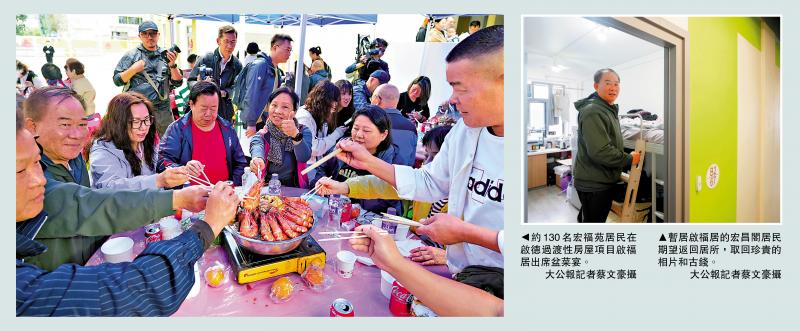 社会各界持续关心与支援大埔宏福苑受灾居民,有团体趁新春期间举办四场盆菜宴,邀请暂时居住于过渡性房屋的宏福苑居民,一同分享节日喜悦与温情。昨日在启德过渡性房屋的盆菜宴,不少宏福苑居民带上亲友出席团聚。政府正在部署安排居民返回宏福苑单位收拾物品,有居民表示打算取回旧照片。有宏志阁居民表示,希望宏志阁获纳入收购范围。\大公报记者 黄佩琳、张腾