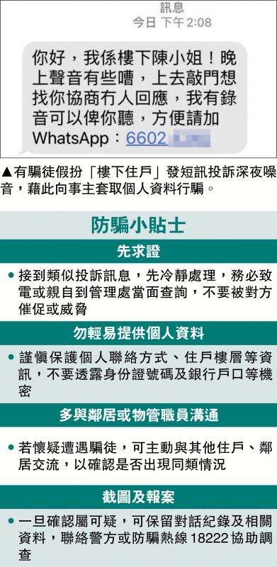 【大公报讯】记者盛德文报道:近年电讯诈骗手法层出不穷,近日,有读者向《大公报》提供可疑短讯对话截图,疑似近期新兴诈骗手法──假扮“楼下住户”投诉深夜噪音,再借此向事主套取个人资料,进一步诱人入局行骗。私隐专员公署及警方提醒市民,慎防诈骗手法,切勿轻易透露个人资料及轻易相信初相识的陌生人;如有怀疑可致电防骗易热线18222查询,或截图报案。