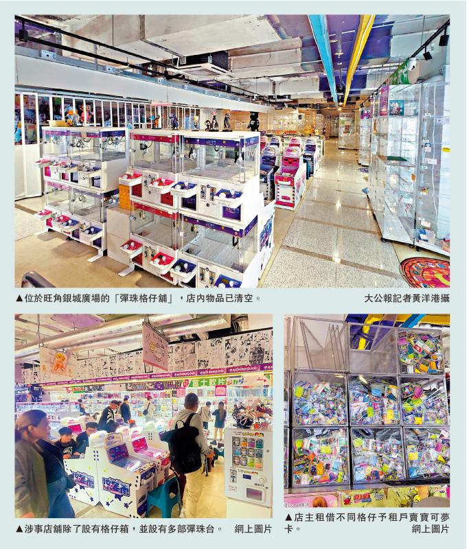 涉事“流星雨台式弹珠及格仔舖”位于旺角银城广场,面积约1000平方呎,店内共有230格柜台、八部夹公仔机及20部弹珠台,店方以月租方式,将柜台及机台租予不同人士。大公报记者昨日前往了解,发现舖内物品已被人清空。