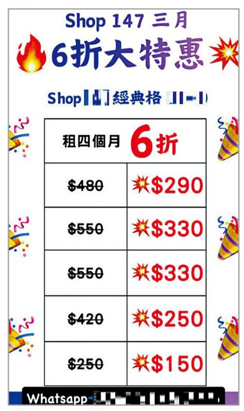 大公报记者昨日翻查格仔舖招租广告情况,为能够吸引更多人租格位,不少店主各出奇谋,有的多租多折,有的长期租更有特别折扣,例如油麻地现时点,有店主推出大单格长租优惠,连续租四个月,可获六折优惠,原价550元的格仔,长租下来月租减至330元,部分甚至低至月租150元。\大公报记者 伍轩沛