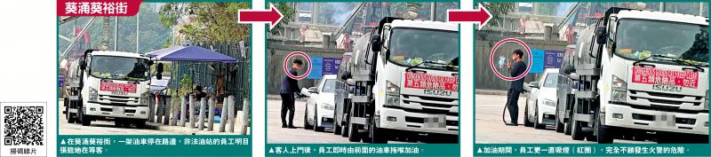 随着国际油价飙升,非法油站在香港数量大增。大公报记者近日侦查发现,葵涌葵裕街和青衣青尚路泊有多辆油车,光天化日之下经营非法油站,背后更由黑帮操控,车主需经熟人介绍才可入油。其中在青尚路多达四档非法油站,工作人员较为警惕,不时四处张望,入油过程迅速;葵涌葵裕街一个非法油站,有入油员罔顾安全,入油时仍然吸烟,一旦爆炸起火,后果不堪设想。