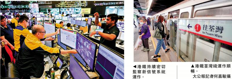 新信号系统利用无线通讯技术,列车改以“移动区间”原理运作,令列车之间灵活地保持安全距离,屯马綫及东铁綫亦正应用。港铁指荃湾綫切换新系统后,整体运作畅顺。港铁并发布在车站、信号设备房等切换信号系统的照片,指荃湾綫更新新信号系统后首日(昨日)整体行车畅顺,已加派近200员工在沿綫各站帮忙,又预计磨合期持续一段时间。
