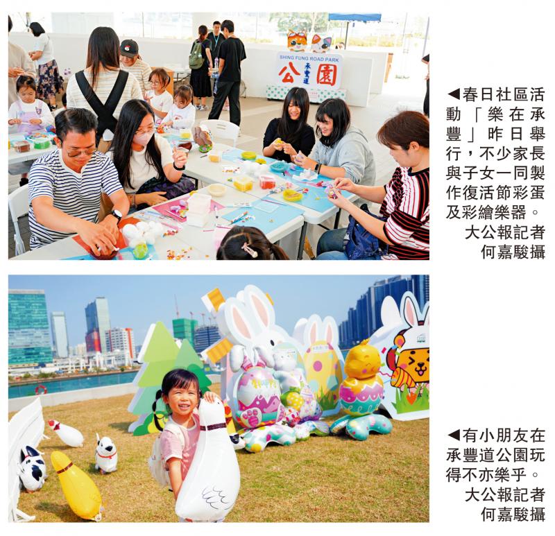 【大公报讯】记者黄佩琳报道:复活节将至,市民有不同休闲活动可参加。土拓署昨日在启德承丰道公园举办春日社区活动“乐在承丰”,有工作坊制作复活节彩蛋、彩绘乐器等,吸引不少亲子来此度过愉快周末。有小朋友表示喜欢画画,很开心画自己的结他。有市民表示乐见区域发展,市民有更多活动可参加。