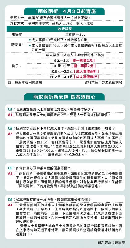 A4:二元优惠计划下的受惠人士如乘搭设有前段分段收费的专营巴士路线(新大屿山巴士除外),上车时须以指定八达通拍卡,按显示的成人票价支付“两蚊两折”车费,下车前需再次到车上的八达通机或下车后于巴士站的分端机,以同一张指定八达通再次拍卡,以获取前段分段收费回赠。