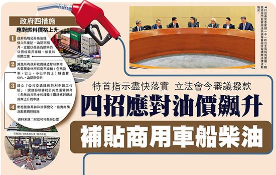 中东局势持续紧张,油价急升影响各行各业。特区政府宣布推出四项短期针对性措施,包括为商用车船提供每公升柴油3元补贴及隧道费减半,为期两个月,预计相关补贴措施约18亿元。行政长官李家超昨日主持特别会议,指示尽快落实相关措施。立法会财务委员会今日下午开会,审议紧急拨款建议。