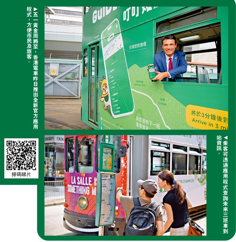 五一黄金周将至,长期受旅客追捧的香港电车,加强推广旅游产品,昨日推出“香港电车”官方应用程式,可使用“电车全景游”功能收听语音导赏,也可即时查看未来三班车到站资讯及突发车务资讯。香港电车将在今年上半年内推出电车美食游,包括地道美食及特色鸡尾酒主题,并计划开发微信小程序,便利内地游客预订电车旅游产品。