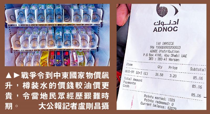 大公报记者走访迪拜的商场、超市、加油站,发现当地的饮用水比油贵,一瓶估计是500毫升左右的樽装水标价3迪拉姆币(约6.4港币),而一公升的石油也才3.2迪拉姆币(约6.8港币)。超级市场内的生果加价近三成,四个苹果卖24.5迪拉姆币(约50元港币)。市民Mohamand在购物时向大公报记者表示,蔬菜和罐头等进口货都涨价了,例如一袋苹果便涨了2迪拉姆币,对于一般家庭来说,面对战争恐慌的同时又要承受食品涨价,确是艰难时刻。