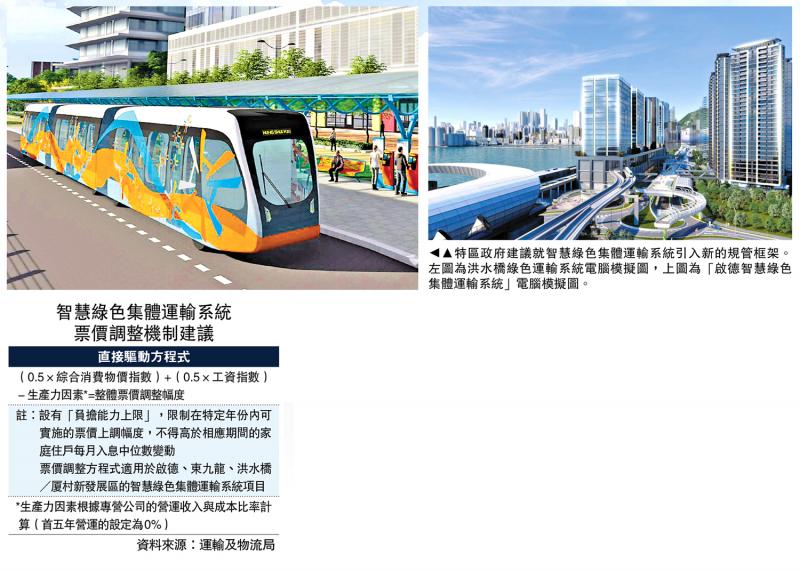 特区政府正全力推展启德等三个智慧绿色集体运输系统项目,透过公开招标引入新营运商。政府建议引入一套新的规管框架,包括订立主体法例订明专营公司的专利、责任和罚则等,赋权行政长官会同行政会议批予或延续专营权,首段专营权一般最长50年,以及透过专营权协议订明服务水平。政府建议的票价调整机制,采用与港铁票价机制类似方程式。