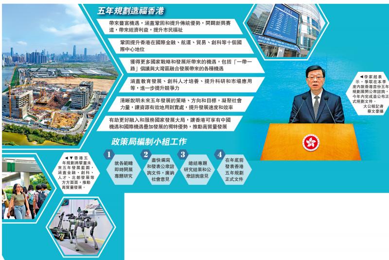 行政长官李家超昨日表示,政府正密锣紧鼓,争取本季内发表香港五年规划的公众咨询文件,广纳意见,令政府可在今年内公布正式文件。他指出,今次是香港首次制定五年规划,时间紧迫、研究工作量大,政府和立法会已成立协同机制,就多项发展专题进行研究,收集专项意见,并在政府发表公众咨询文件后协同收集社会意见。香港五年规划会清晰说明未来五年经济和社会发展的策略方向和目标,让资源有效用到实处,形成社会协同效应。