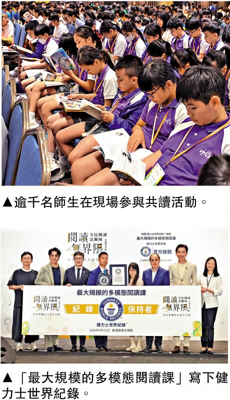 【大公报讯】记者郭如佳报道:昨日(23日)是世界阅读日,亦是国家“全民阅读活动周”,为响应“全民阅读活动周”,教育局昨日在启德体育园举办“阅读无界限分享会暨中小学联校共读半小时”活动,吸引线上线下逾三万名师生同步参与,共创“最大规模的多模态阅读课”健力士世界纪录。教育局局长蔡若莲鼓励同学抽出时间,多进行阅读,形容“每一次阅读都是一场心灵探险,每一本书都会带我们看到不同世界”。