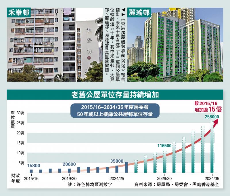 团结香港基金昨日发表《香港房屋趋势导航2026》报告指出,本港住宅市场正处于关键转捩点,房委会未来10年有逾23万个公屋单位达到50年楼龄,评估禾輋邨、大兴邨、丽瑶邨、沥源邨具高重建价值。