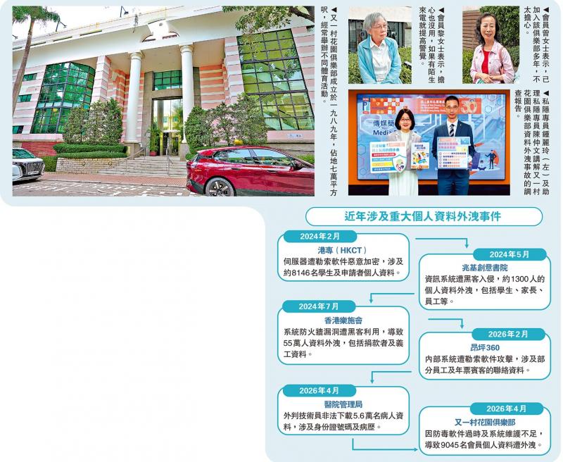 再有机构发生严重个人资料外洩事件。个人私隐专员公署公布最新调查报告,位于九龙塘的又一村花园俱乐部的伺服器,去年10月遭黑客入侵,9045名会员及前会员的个人资料外洩,调查揭示俱乐部出现多重缺失,包括远端存取软件存在保安漏洞、防毒软件及防火墙过时,过长时间保留会员资料等,违反私隐条例。
