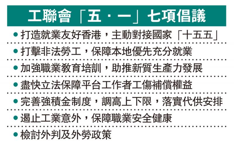 【大公报讯】记者龚学鸣报道:工联会昨日举行“五.一”国际劳动节政策倡议记者会,提出“保障本地就业 加强职业培训 共享发展成果”三大方向下的七项主要劳工政策倡议内容,促请特区政府正视当前劳工保障不足,共同推动政策完善。工联会会长、立法会议员吴秋北,理事长、立法会议员黄国等多位负责人及约50名行业和工友代表出席。
