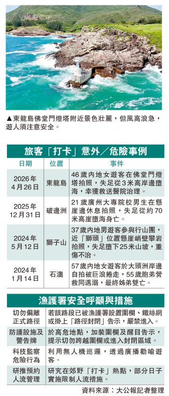 西贡游客“打卡”堕海意外时有发生。2025年12月31日早上10时14分,来自广州的21岁姓黄男子在西贡破边洲行山,其间行到悬崖位置拍照疑失足堕70米下海面,同行同学报警求助,黄男送院抢救后证实不治。渔护署曾经多次发布行山安全指引,提醒游人切勿跨越围栏冒险拍照。