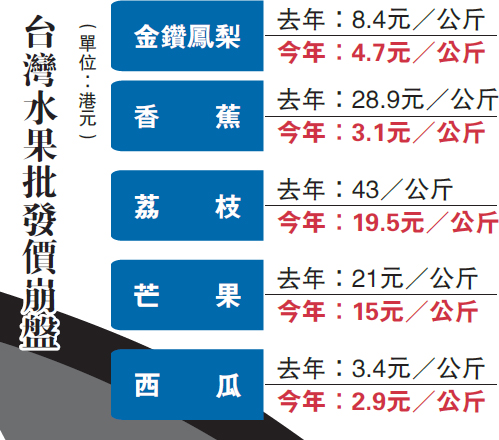 据台媒报道,在嘉义县竹崎乡,二三十公斤的生蕉可能卖不到30元。蕉农黄浚豪说,夏蕉通常价格最差是在7至9月,但今年才入夏,产地收购价就跌到近谷底。台南市关庙区的凤梨价格也大跌。屏东除凤梨产量过剩,“玉荷包”品种的优质荔枝价格现也跌到初上市的四分之一不到。