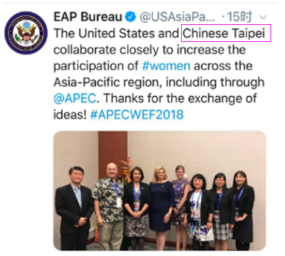 近日,亚太经济合作组织妇女与经济论坛(APEC WEF)举行。美国国务院东亚暨太平洋事务局发文表示,“美国与中国台北(Chinese Taipei)紧密合作,包括通过APEC活动,促进妇女参与亚太地区事务。”尽管并非APEC正式场合发言,美方的贴文也以“中国台北”称呼,以表明其态度。