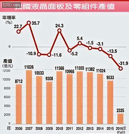 台湾面板产业曾辉煌一时,2007年在液晶电视、笔电、手机等产品需求带动下,产值突破万亿新台币大关,并写下1.18万亿新台币产值的历史新高。而受惠全球智能型手机及平板电脑销售畅旺,及市场对大尺寸电视面板需求热络,自2010年起,台湾面板产业连续5年产值维持1.1万亿元左右。