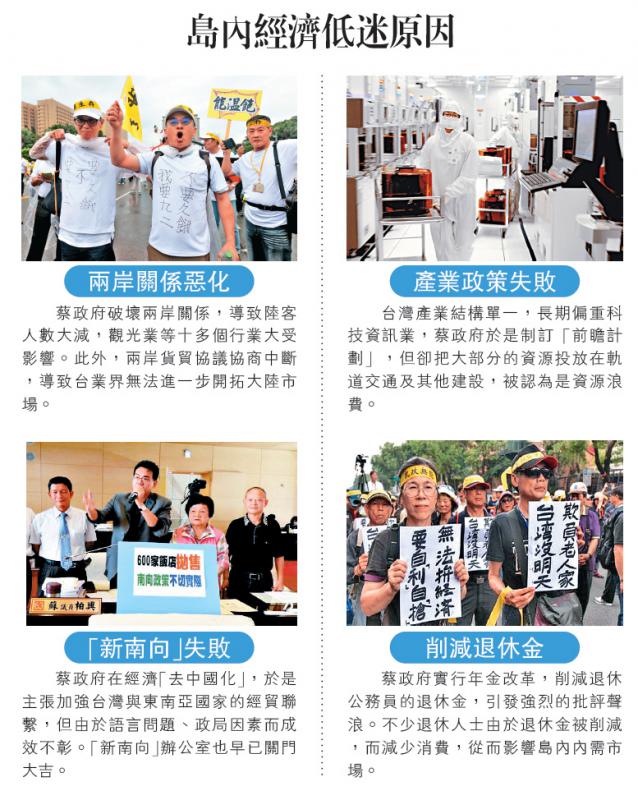针对台湾经济增速水平居“四小龙”之末,厦门大学台湾研究院经济所副所长王勇向大公报指出,台湾经济近几年持续低迷主要有三个原因。首先,2016年5月民进党蔡英文当局上台以来,不顾台湾对大陆进出口贸易依存度为近40%的现实,破坏两岸关系,在经济上实行“去中国化”的“新南向政策”,试图减少对大陆的依赖。虽然台湾过去的领导人大力鼓吹“经济南向”,但由于语言不通、“南向”国家政局不稳等因素而均以失败告终,如今蔡政府亦然。此外,台当局对大陆新兴技术企业和现代服务业企业赴台投资百般设立人为限制加以阻碍。最终导致台湾岛内投资消费市场双重不景气。