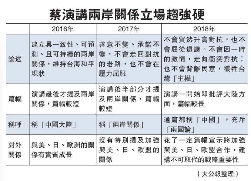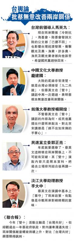 蔡英文的讲话显示当局不仅无意改善两岸关系,而且还企图拉拢美国、日本和欧盟对抗中国大陆。其言论受到两岸舆论严厉批评。