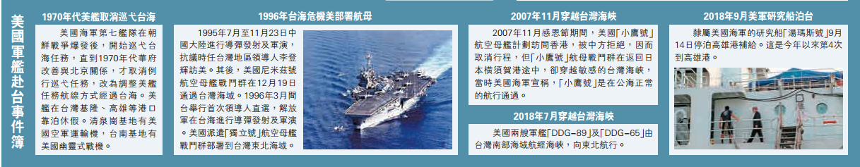 针对美国或再派军舰穿过台湾海峡的举动,台湾竞争力论坛执行长谢明辉向大公报表示,美国打“台湾牌”牵制中国大陆已成为常态,是中美贸易战全面竞争的一环。其目的包括三方面:一是特朗普为了赢得美国的中期选举;二是以“自由航行”为藉口扞卫美国霸权;三为民进党赢得台湾地方选举创造想像空间。