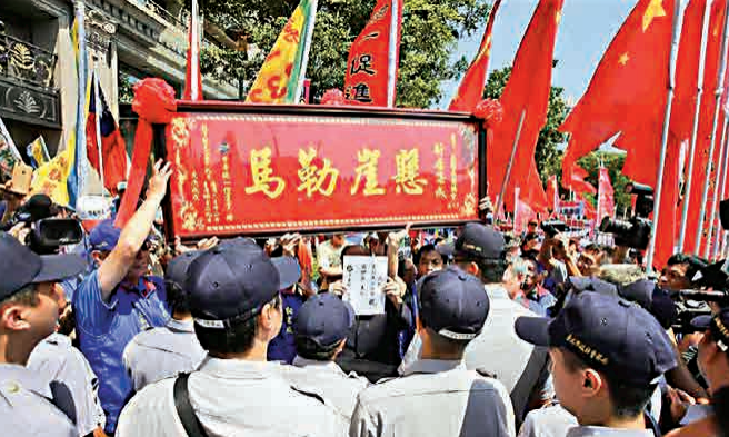 图:今年六月十二日,美国在台协会(AIT)台北内湖新馆举行落成典礼,统派团体在场外抗议,并送“悬崖勒马”的匾额 资料图片