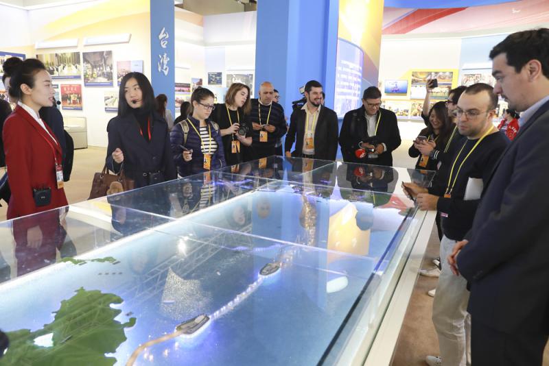 图:去年十月,来自拉美、海湾等地区的多个记者团在北京参观“砥砺奋进的五年”大型成就展。图为记者们在港珠澳大桥模型前听讲解\资料图片