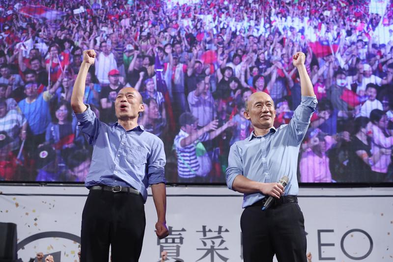 图:国民党高雄市长候选人韩国瑜(左)日前在高雄举行造势大会,艺人郭子干(右)也模仿韩国瑜现身,带动气氛\资料图片