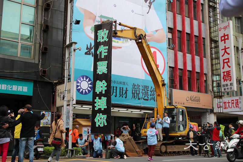 图:国民党新竹市长候选人许明财团队二十二日请来机械怪手,象征挖掘真相、铲除黑招\中央社