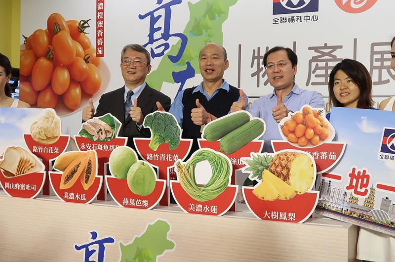 图:高雄市长韩国瑜(左二)19日推荐十款高雄农特产品\台湾“中央社”