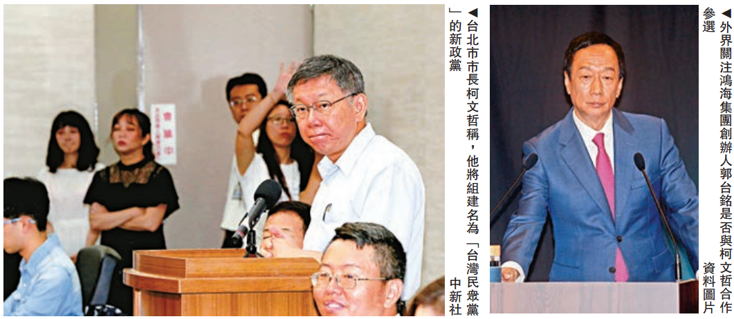 柯文哲筹组台湾民众党。他表示,希望以人为本,盼在蓝绿外有选择机会,进“立法院”是一个目标。对于选不选台湾地区领导人,他说,9月17日是登记期限最后一天,若没登记就代表不选。