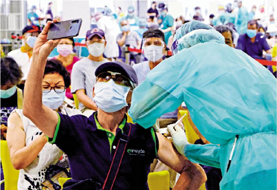 图:台北民众十四日在圆山花博争艳馆接种新冠肺炎疫苗。图为民众自拍接种疫苗的过程。/中通社
