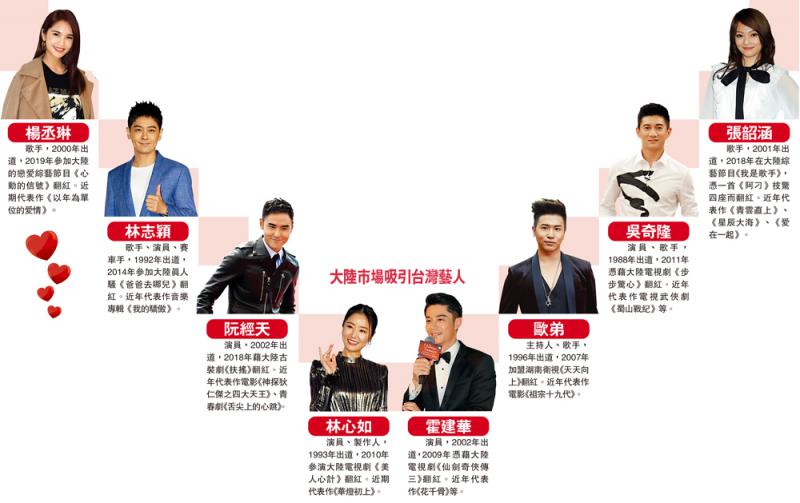 随着大陆政治、经济、文化实力逐渐与台湾拉开差距,大陆娱乐市场规模不断扩大,资本争相涌入,台湾许多艺人选择登陆发展。而大陆的电视剧、电影、综艺节目开始触及岛内年轻人。如今,大陆的历史剧、清宫剧,如《甄嬛传》等已受台湾观众追捧;大陆的抖音神曲,岛内年轻人也会唱;亦有台媒报道,大陆游戏占台湾市场七成。