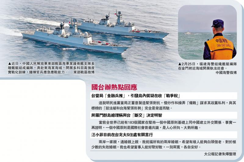 台当局财政部门负责人王美花称,相关部门和机构已做过“金融兵推”,如果两岸开战,为筹措“战备资金”,可以考量增加税、费,引发岛内质疑是在收“战争税”。陈斌华对此表示,这说明民进党当局正蓄意制造紧张对抗,借炒作和操弄“备战”谋求其政党私利,与其标榜的“设法缓和台海紧张形势”完全是背道而驰。如果任由他们在“台独”的邪路上走到黑,广大台湾同胞将是最大的受害者。