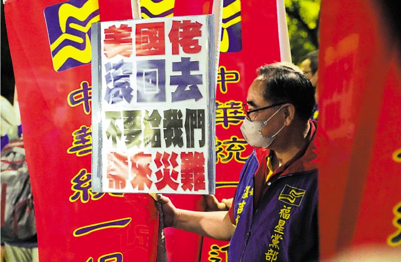 图:台湾民众高举标语牌,批评美国政府插手台湾问题破坏台海和平。\资料图片
