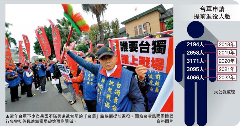图:近年台军不少官兵因不满民进党当局的“台独”路线而提前退役。图为台湾民间团体举行集会批评民进党当局破坏两岸关系。\资料图片