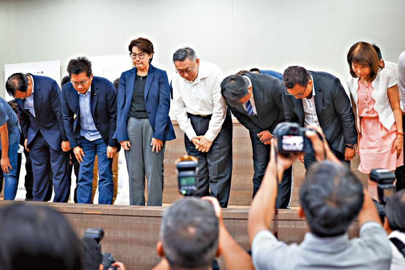 图:民众党主席柯文哲(中白衣者)29日下午在台北举行记者会,对于政治献金案,率领党内同仁向公众道歉。