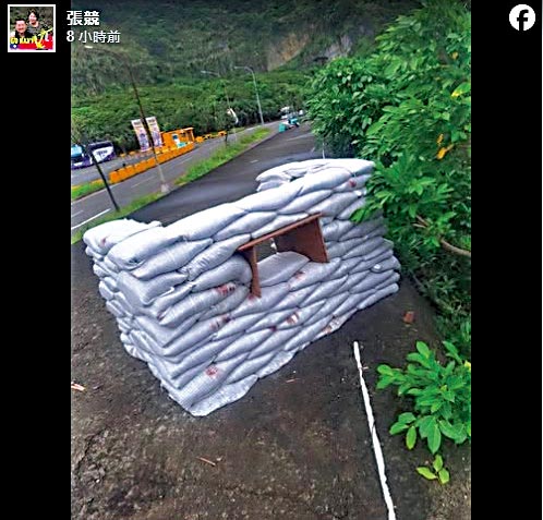 图:外界批评台军在演练期间砌成的沙包掩体竟然连掩护的颜色都没有。\网上图片