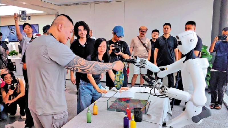 图:台网红“馆长”陈之汉近日在深圳参访期间与机器人合作制作“漆扇”。\大公报记者郭若溪摄