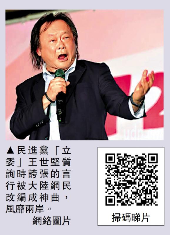 图:民进党“立委”王世坚质询时夸张的言行被大陆网民改编成神曲,风靡两岸。\网络图片
