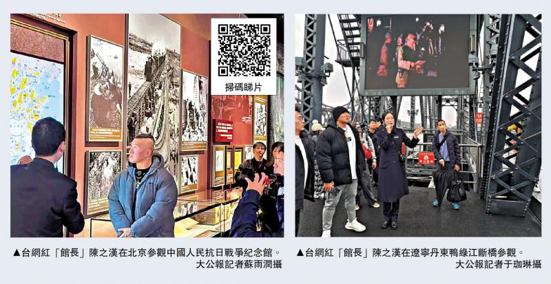 左图:台网红“馆长”陈之汉在北京参观中国人民抗日战争纪念馆。\大公报记者苏雨润摄;右图:台网红“馆长”陈之汉在辽宁丹东鸭绿江断桥参观。\大公报记者于珈琳摄