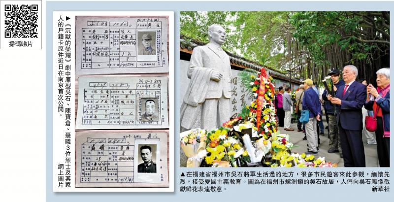左图:《沉默的荣耀》剧中原型吴石、陈宝仓、聂曦3位烈士及其家人的户籍卡原件近日在南京首次公开。\网上图片 右图:在福建省福州市吴石将军生活过的地方,很多市民游客来此参观,缅怀先烈,接受爱国主义教育。图为在福州市螺洲镇的吴石故居,人们向吴石雕像敬献鲜花表达敬意。\新华社