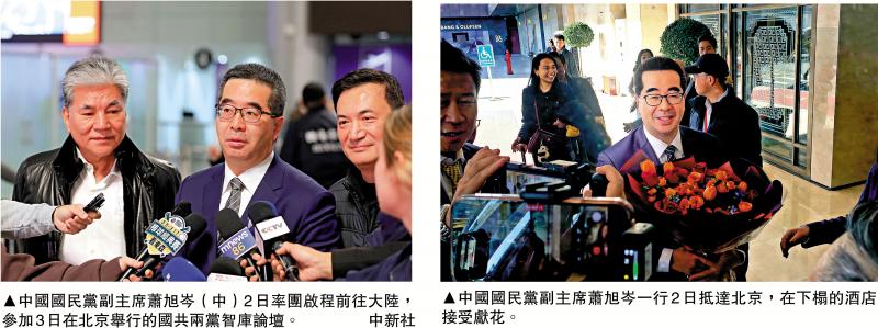 中国国民党副主席萧旭岑偕同国民党智库副董事长李鸿源2日上午率团前往北京,参加3日举行的国共两党智库论坛。萧旭岑行前受访表示,国民党此行定位明确,将扮演台湾产业的沟通者、台湾百姓的保护者,以及两岸和平的缔造者。国共机制化交流重启引起台湾社会广泛关注。