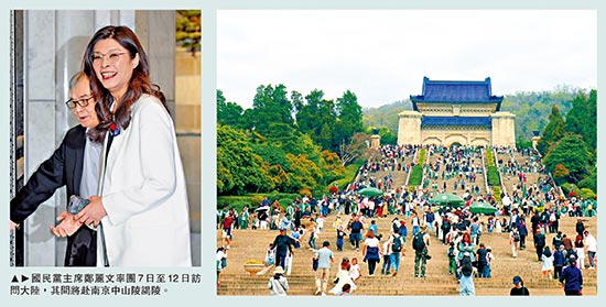 综合台媒及中通社报道:郑丽文一行7日由台北松山机场启程,于当天下午飞抵上海,随即前往南京,并于8日赴中山陵谒陵,再返回上海参访与出席活动,预计在9日下午转往北京访问。