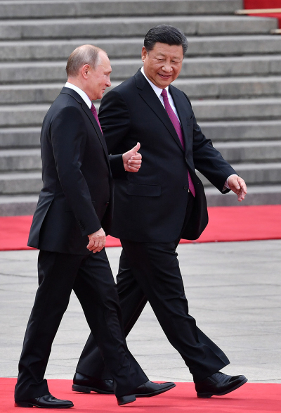 图:习近平在欢迎仪式上与普京交谈\中新社