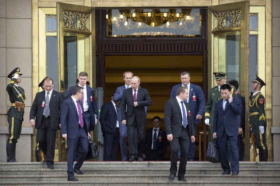 图:俄罗斯总统普京(中)8日离开北京人民大会堂\美联社