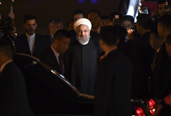 图:伊朗总统鲁哈尼8日抵达青岛机场\美联社