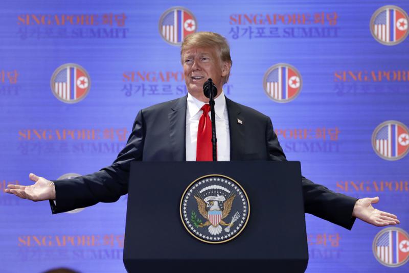 图:特朗普12日在新加坡圣淘沙召开记者会 美联社