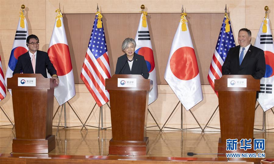 6月14日,在韩国首尔,(从左至右)日本外务大臣河野太郎、韩国外交部长官康京和与美国国务卿蓬佩奥举行会谈后召开联合记者会。康京和当天与来访的美国国务卿蓬佩奥、日本外务大臣河野太郎举行会谈,并召开联合记者会。康京和在记者会上说,韩美联合军演将由双方军事部门协商决定。新华社发 李相浩 摄