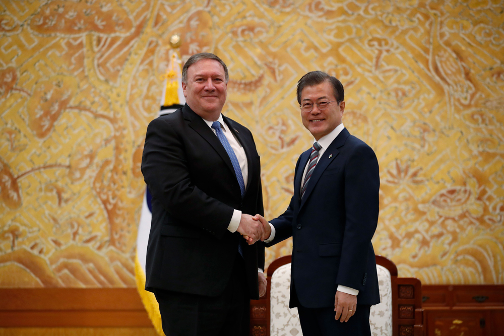 图:文在寅(右)14日在青瓦台接见蓬佩奥 /法新社