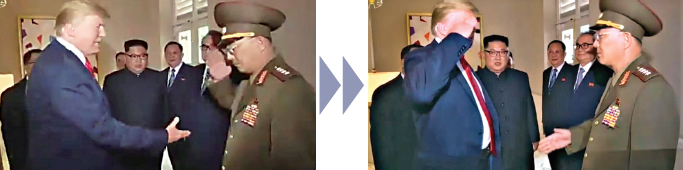 据美国CNN网站报道:朝鲜官方电视台14日播出一段金正恩12日在新加坡,与美国总统特朗普会面的视频,内含特朗普“尴尬一幕”。画面显示,金正恩介绍随团的人民武力相努光铁时,特朗普先是伸出右手,不料对方抢先敬了个军礼;特朗普反应过来后立即改行军礼,不料努光铁又伸出右手;特朗普再次“慢半拍”,伸手相握。